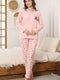 طقم بيجاما بأكمام طويلة مضلعة مطرزة بدب تيدي، لون وردي فاتح