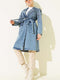 معطف ترنش من الدنيم بحزام وجيبين مزدوجين، أزرق فاتح