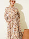 فستان بني اللون، بياقة صينية ونقشة على شكل نفق عند الخصر