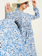 فستان أزرق بنقشة مميزة، بياقة صينية وحزام خصر مرتفع.