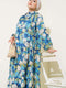 فستان بياقة صينية وأساور مطاطية ونقشة زهور، باللون الأزرق الداكن