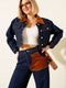 طقم جينز من قطعتين مع جاكيت قصير بتفاصيل مخملية، أزرق داكن