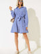 فستان قصير مخطط بأزرار باللون الساكسوني
