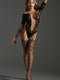 بدلة جسم سوداء بنقشة وردة وياقة قارب من قماش شبكي، أسود