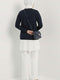 سترة زرقاء داكنة مع تنورة سفلية مطوية وشعار