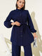 بدلة مكونة من قطعتين بأزرار ورباط على الخصر والكتف، باللون الأزرق الداكن