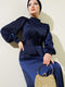 فستان ساتان أساسي مع حزام مطوي باللون الأزرق الداكن