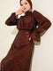 فستان سهرة بني ذو حزام وتفاصيل من الترتر