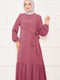 فستان وردي اللون بربطة عنق مع تفاصيل من الحساسية والحجر في الأمام