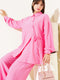 طقم تونيك وردي اللون مكون من قطعتين، مزين بأزرار متقاطعة ورباط.