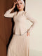 بدلة من قطعتين بتفاصيل حجرية وتنورة مطوية باللون البيج