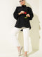 قميص أسود بأكمام طويلة وحزام على الكتف