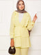 • Ürün Yazlık. Önden fırfıt detaylı ve tek düğmeli belden seyyar bağcıklı pantolon belden lastikli ikili takım