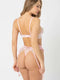 Ensemble de lingerie fantaisie 3 pièces en satin et dentelle rose à rayures, avec porte-jarretelles.
