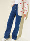 Jean en denim bleu à jambes larges avec boutons métalliques sur le devant.