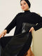 Deri şıklığının siyah ile buluşması...Elbisemiz oldukça zarif ve şık bir görünüme sahiptir. Göğüs kısmından başlayan deri detayı eteklere kadar devam etmektedir. Etek kısmı kloş modele sahip elbisemiz bisiklet yakalıdır. Zincir püskül detayları ile süslenen elbisemiz rahat yapıya sahiptir.