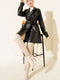Trench-coat court en cuir noir, croisé et ceinturé.