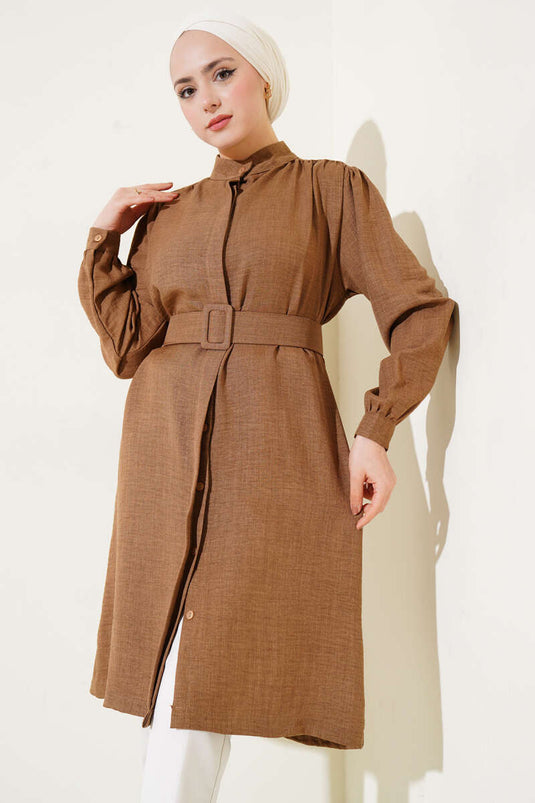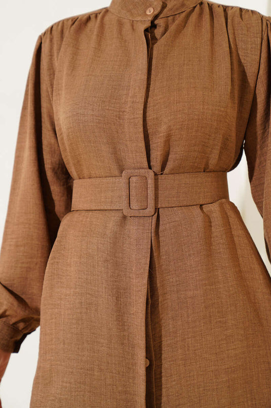 Hakim Yaka Kemerli Uzun Gömlek Kahve