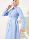 Boydan Düğmeli Kuşaklı Çizgili Elbise Buz Mavisi