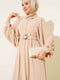 | Name | Beigefarbenes Kleid mit halber Knopfleiste, Ballonärmeln und Gürtel |