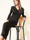 Schwarzes Kleid mit verzierten Schulterpolstern und V-Ausschnitt.