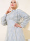 Our new season dress is with you. My dress is an embroidered tulle model. The front has a v-neck covered with tulle. Our dress is a fitted model at the waist. It has a stand-up collar and a zip at the back. Our dress will be your favorite with its elegance. Color options are available.