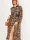 Leopard Pattern Midi Dress with Buttons at the End, Camel