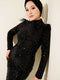 Black Sequined Evening Dress with Feathered Shoulders and Black