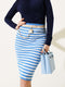 Striped Elastic Waist Knit Midi Skirt Indigo