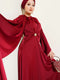 NameRobe de soirée en satin bordeaux, froncée à la taille.