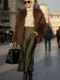 Manteau croisé doublé de fourrure marron foncé.