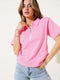 Roze T-shirt met schoudervullingen en ritssluiting.