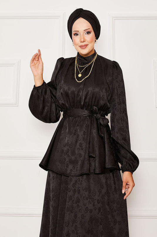 Costume deux pièces en jacquard noir à taille élastique et ceinture amovible
