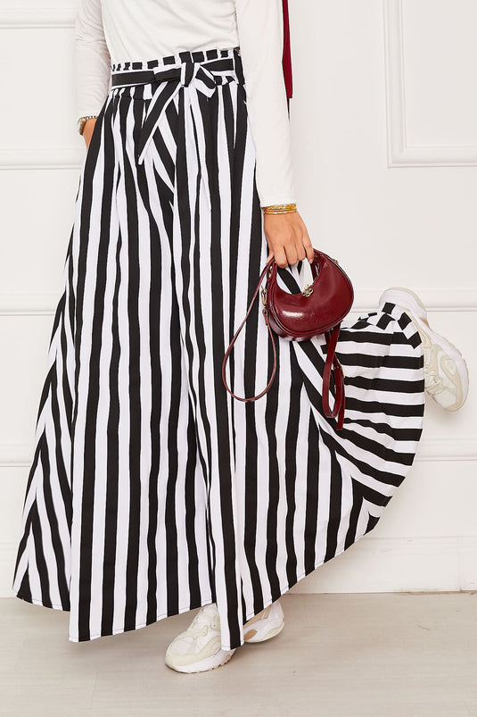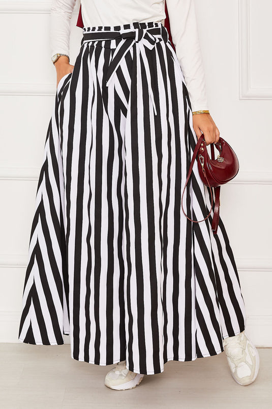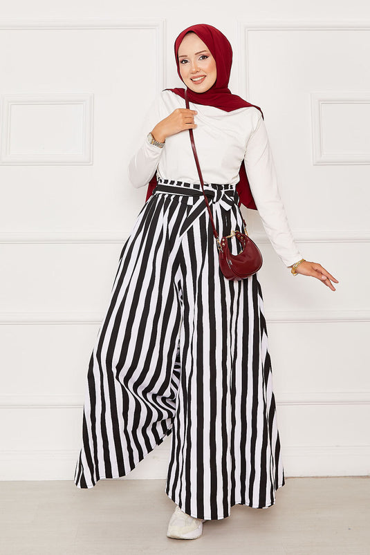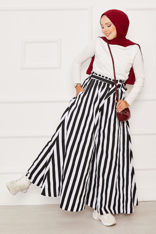 - Ürün mevsimliktir. Astarsızdır, çizgi detaylı beli lastikli ve belden kuşaklı etek pantolon