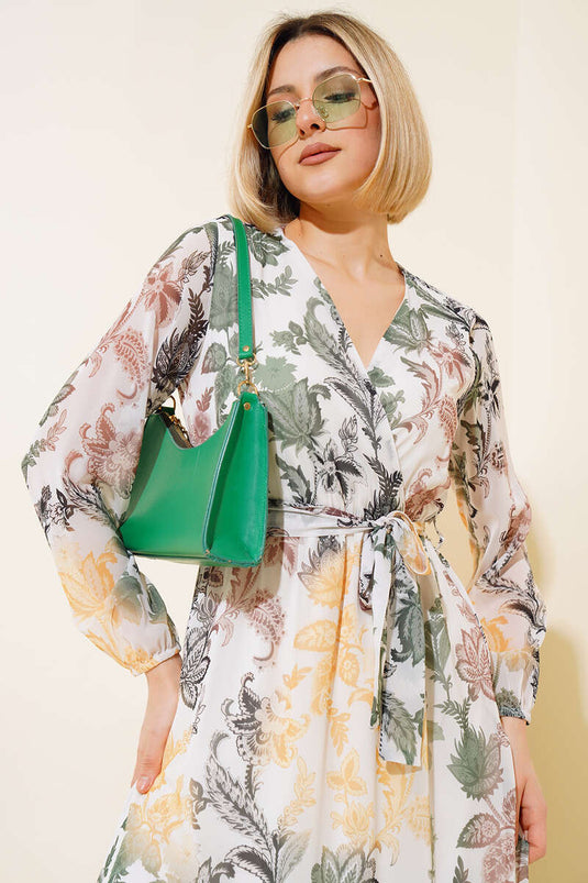 Notre modèle de robe nouvelle saison est avec vous. Notre robe a un col croisé. Il a des manches longues. Les poignets et la taille sont élastiqués. C'est de la mousseline. Notre robe a deux passants de ceinture et une ceinture. Il est doublé.