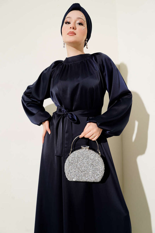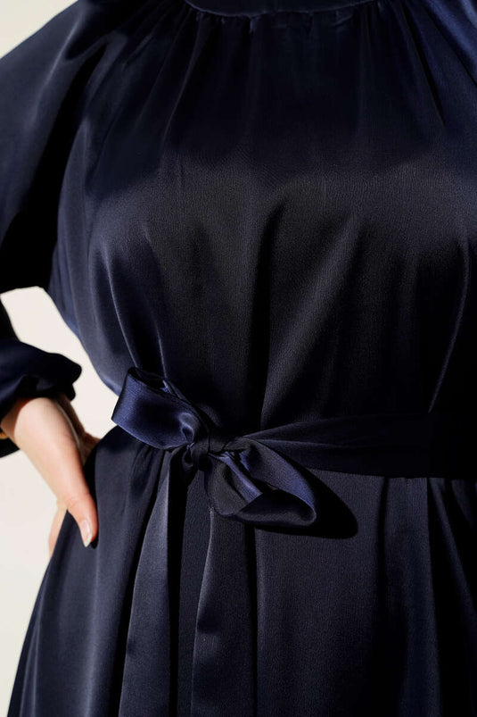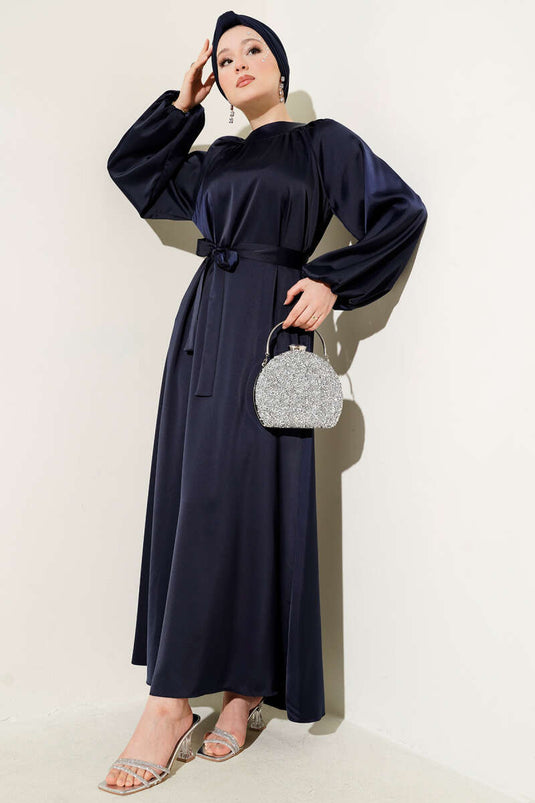 Robe de soirée en satin à manches ballon et ceinture bleu marine