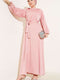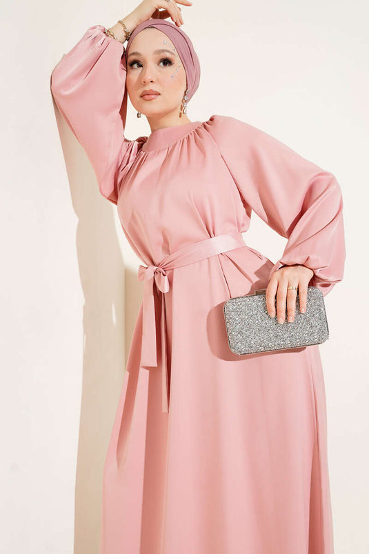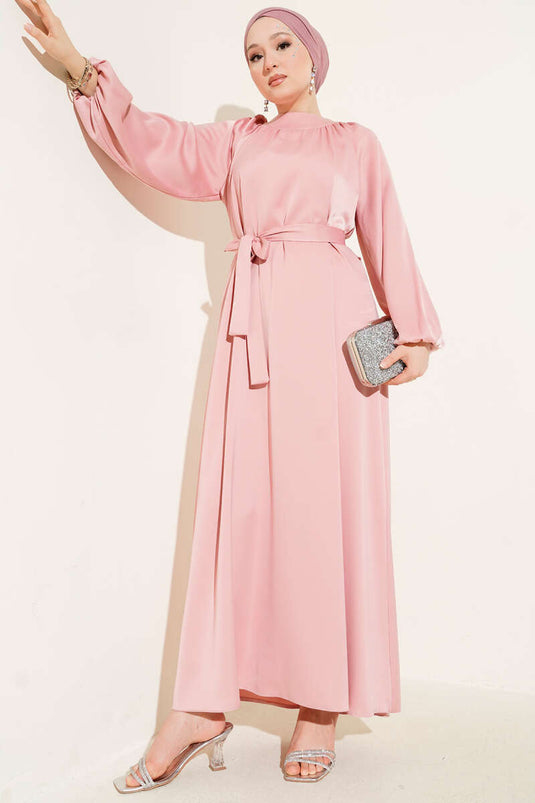 Robe de soirée en satin à manches ballon et ceinture, couleur poudre