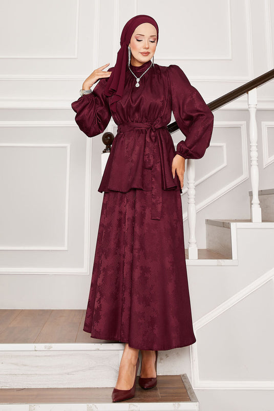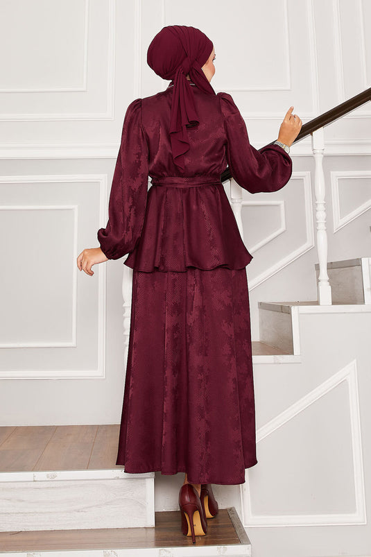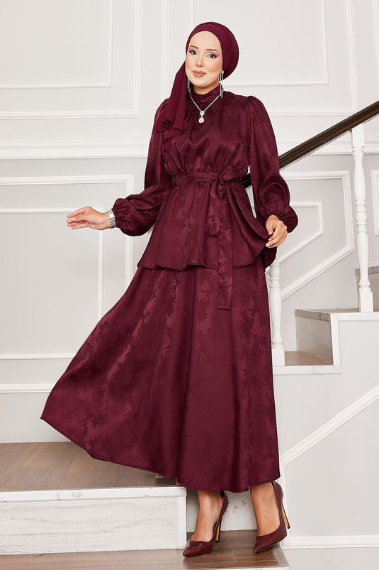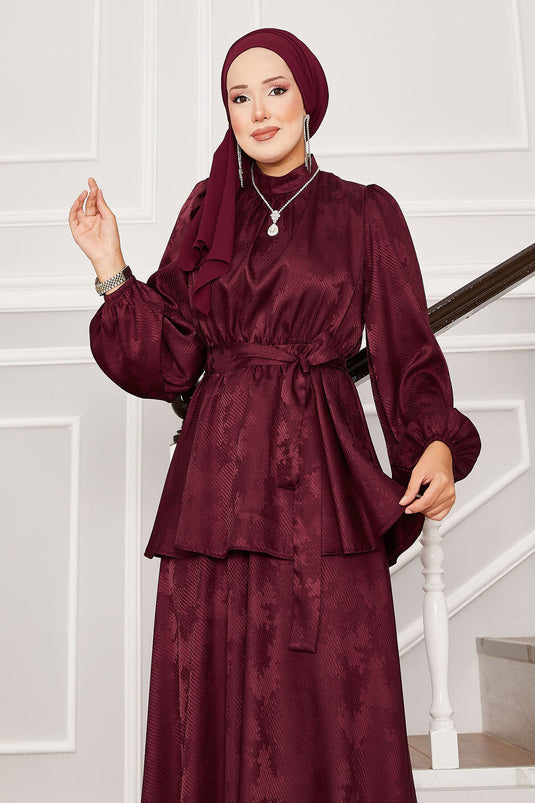 | Name | Costume deux pièces en jacquard avec ceinture amovible et taille froncée, bordeaux |