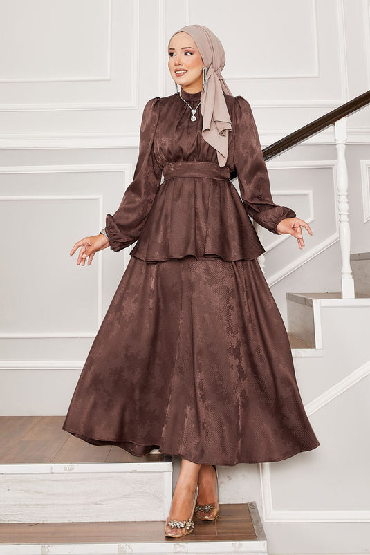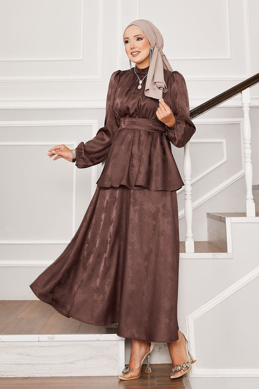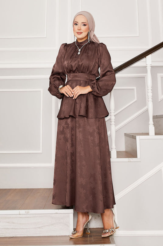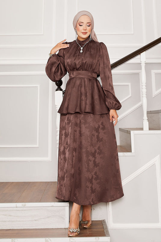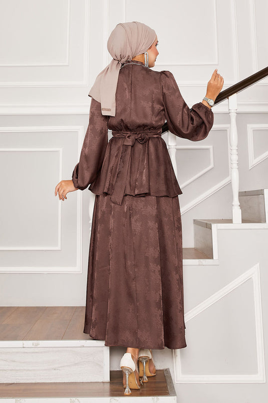 Costume deux pièces en jacquard marron avec ceinture amovible et taille froncée