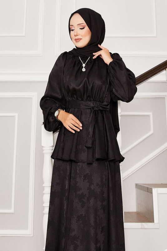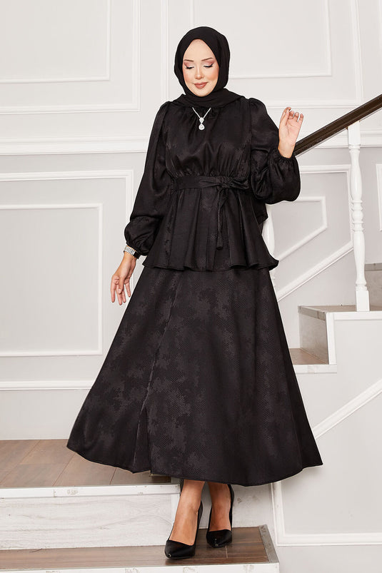 Costume deux pièces en jacquard noir avec ceinture amovible et taille froncée