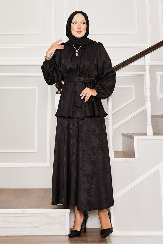 | Name | Costume deux pièces en jacquard noir avec ceinture amovible et taille froncée |