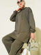 Costume deux pièces à capuche kaki avec boutons métalliques sur les côtés
