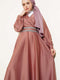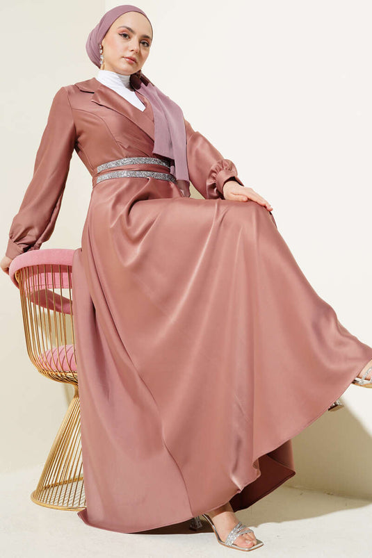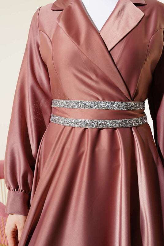 Taş Kuşaklı Kruvaze Yaka Saten Elbise Pudra