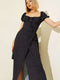Puantiyeli Yırtmaçlı Midi Elbise Siyah
