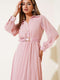 Bel Lastikli Pileli Kemerli Şifon Elbise Pudra
