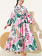 Yarım Düğmeli Renkli Yaprak Desenli Elbise Pembe